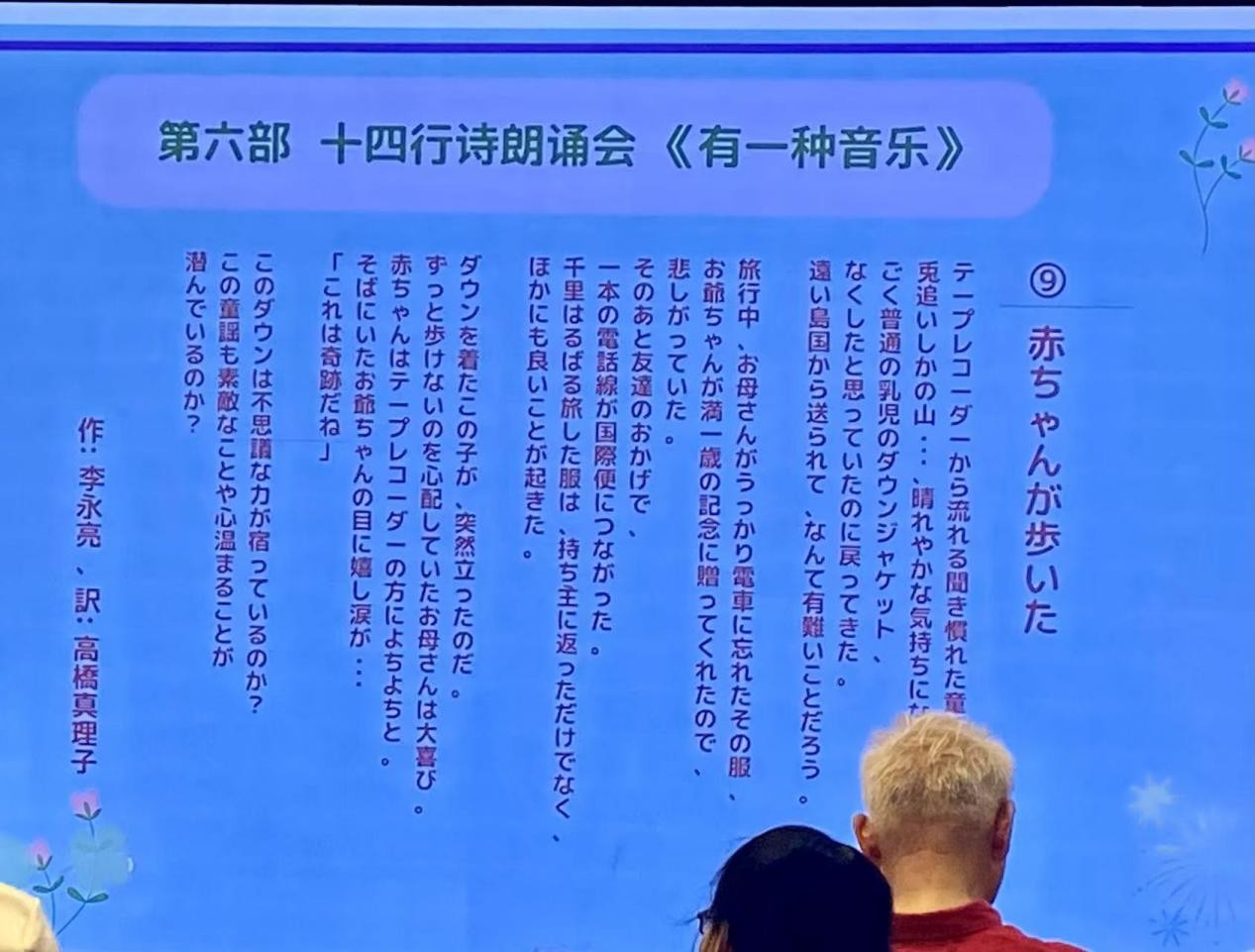 不知是否有与我同感的听众。对于喜欢用双语写点东西的我来说,特别仰慕将每首诗译成日语的高桥真理子老师。当最早知道『霸王别姬』的字幕是高桥老师所翻译时,就被深深地吸引住了。对照着原文读她翻译的诗时,对一些文字的表现会不禁颔首,令人时时会有种豁然开朗的感觉。我奢望着,是否在下次诵读会上,能请林媛老师用日语读一首高桥老师翻译的十四行诗。李永亮老师的诗,高桥老师的翻译,林媛老师那带着磁性的日语发音;只闭眼想象了一下,就觉得是一种享受。