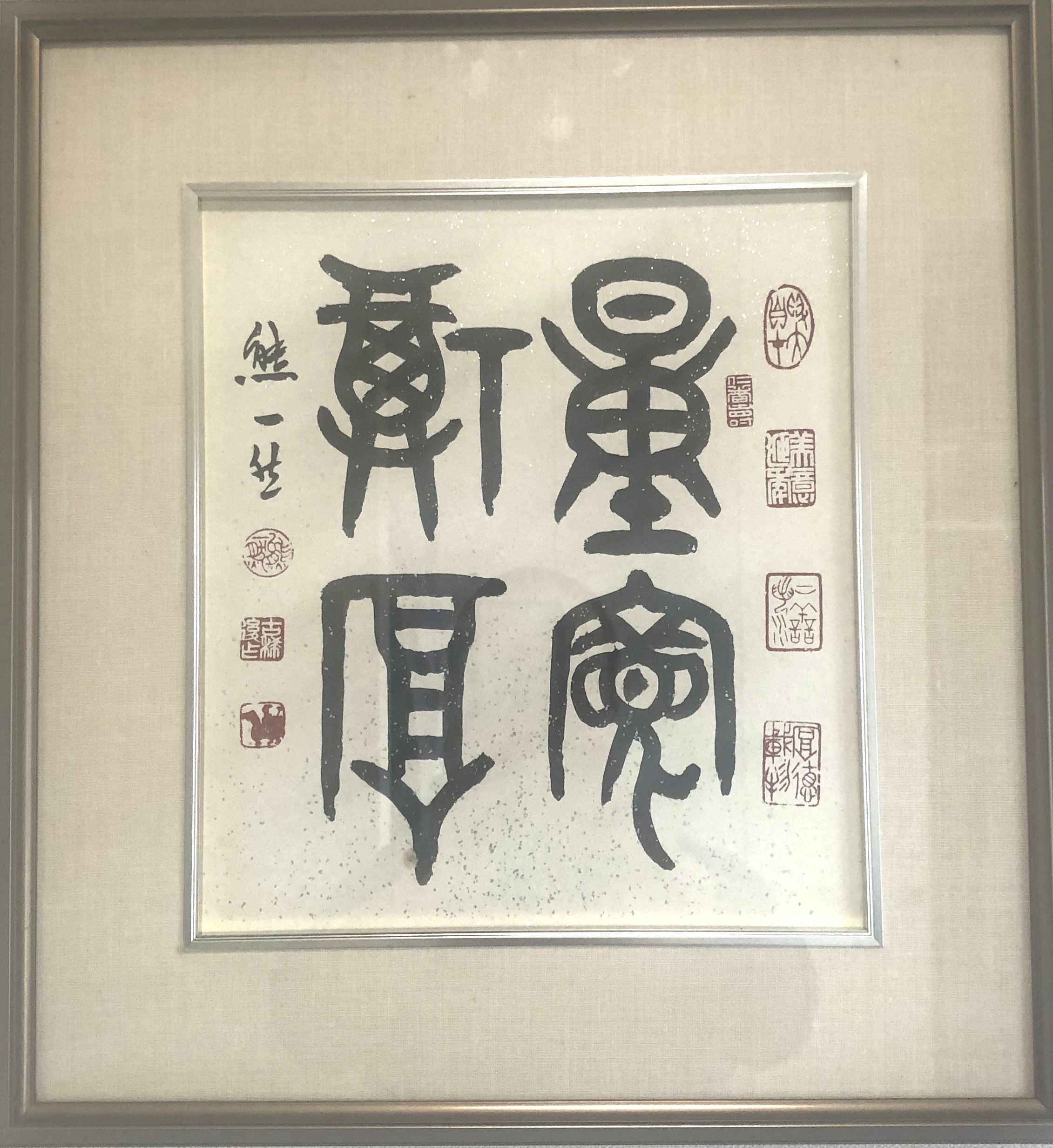 篆书色纸作品,外框高41厘米,宽38.5厘米(画心高27厘米,宽24厘米),有亲笔签名钤印。