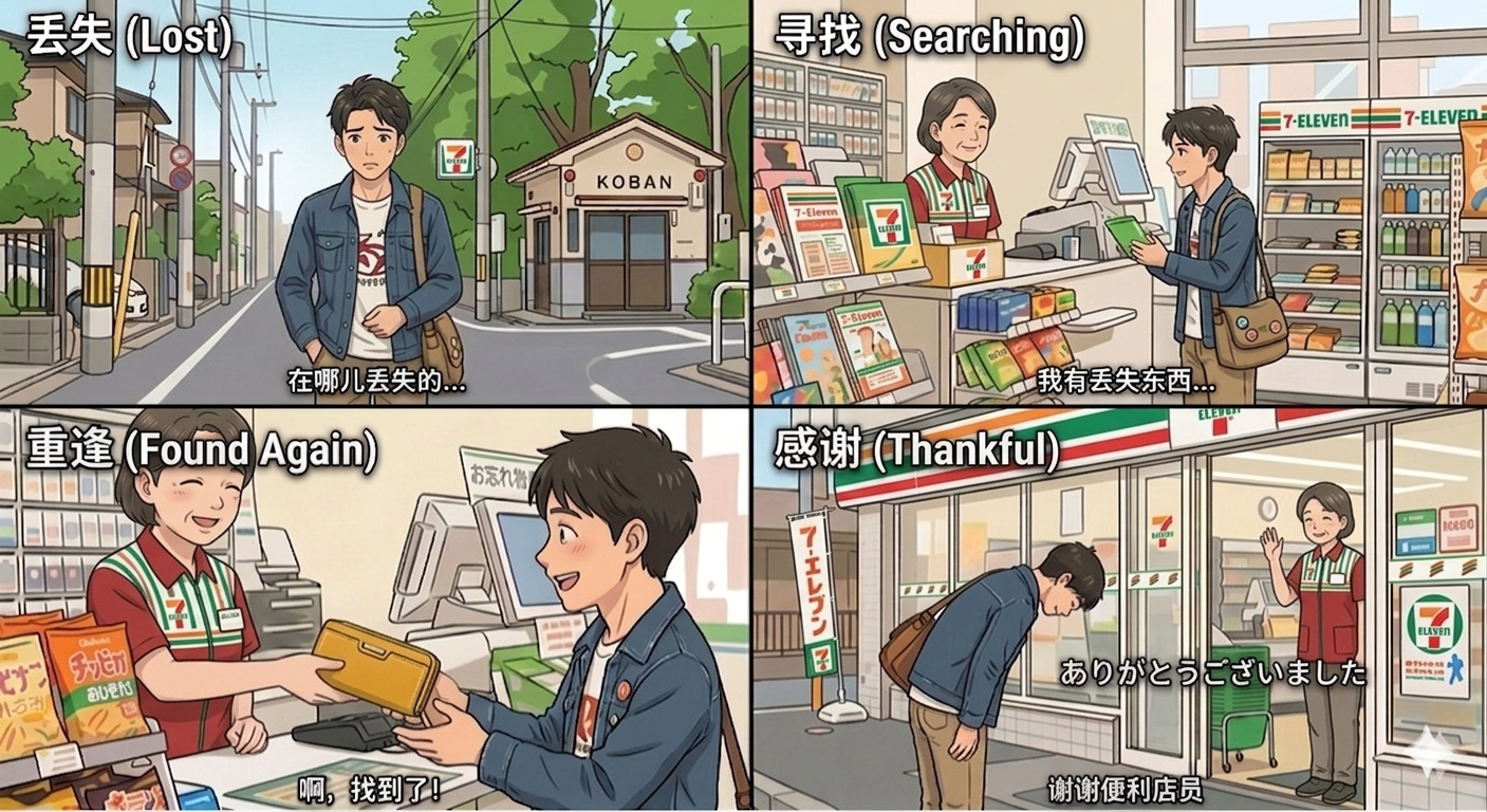 我吩咐说:马上去昨天经过的地方确认一遍,如果没有的话,赶快去附近的交番(派出所)提交丢失申告。